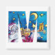 M bold alphabet letter initial design. Musical ,whimsical and artistic watercolor painting with vibrant red ,blue, yellow, white colours by Bulgan Lumini (c). Santa Claus is playing violin in the snowy winter night under the blue sky ,moon and yellow stars with a funny ,expressive owl ,cat and his Christmas sack full of colourful presents