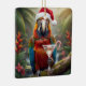 A colorful parrot wearing a Santa hat sits on a branch in a lush jungle, holding a cocktail with a candy cane garnish.