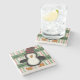 The coasters are gorgeous, a quality feel and heavy weight. They look like a precious archeological find. A rustic stone juxtaposed with a modern floral black and white print. I like the way the print goes slightly imperfect on the cut stone edges giving them a kind-of natural beauty.