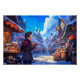 A digital illustration of a cartoon art style of a highly detailed bustling holiday market with stalls selling handmade crafts, ornaments, and festive decorations.