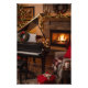 A Christmas piano in a cozy room, adorned with pine leaves and lights, next to a crackling fire. It's the perfect setting to play or listen to Christmas songs, embracing the magic of the season.