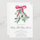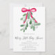 It is decorated with watercolor green mistletoe, a red ribbon, and says "Merry Little Baby Shower" in stylish script typography.