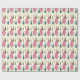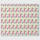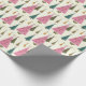 Christmas wrapping paper with angular, abstract Christmas trees in pink, green and gold.