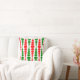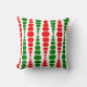 This Christmas throw pillow has a mid-century modern design of red and green rounded rectangles in increasing and decreasing size running vertically on a field of white.