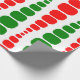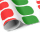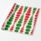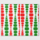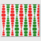 This Christmas wrapping paper has a mid-century modern design of red and green rounded rectangles in increasing and decreasing size running vertically on a field of white.