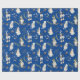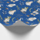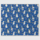 Cute Christmas moose and gnomes skiing on blue background with snowflake overlay.