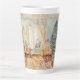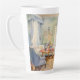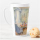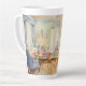 Christmas Morning Latte Mug - the scene is set in a living room with a decorated tree, presents, and a table. The colours are a soft faux watercolor with cream, blue, green, red, and bluegreen. Enjoy this Christmas / Holiday mug all season!