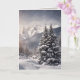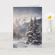 Snow-covered pine trees and mountain peaks with snowflakes.