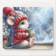 A cosy mouse in a red sweater and hat sits by a frosted window holding a cup of hot cocoa while admiring a snowy landscape with pine trees and snowflakes
