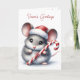 A cute fluffy mouse wears a Santa hat and holds a large striped candy cane