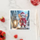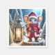 A cute mouse dressed in a Santa outfit stands on a snowy tree stump beside a glowing lantern