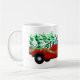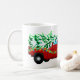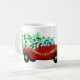 Christmas holiday ceramic coffee mug is shown with a festive holiday red truck print with Merry Christmas text.