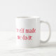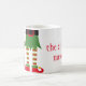 Ceramic coffee mug is shown with a festive Christmas holiday Elf art print with the elf made me do it text.