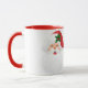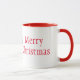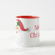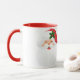 Ceramic coffee mug is shown with a festive Christmas holiday Santa art print with Merry Christmas in text.