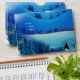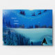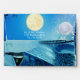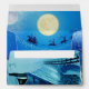 A Blue winter fantasy snow scene with Santa on his reindeer sledge in front of a full moon