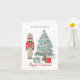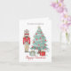 Cute Christmas card for kids - a watercolor illustration of Nutcracker, pine tree, presents, baubles and rocking horse i