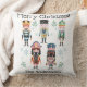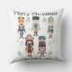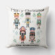 This Christmas holiday throw pillow features a classic toy soldier nutcracker theme. Five different vintage style nutcrackers are printed in a watercolor painting design, and accented with winter branches and snowflakes. A "Merry Christmas" greeting is printed across the top, with a sample family name printed at the bottom. You can personalise the pillow to include your own custom name or text.