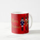 Christmas Nutcracker Trio - is a digital graphic art design. Three Nutcrackers standing side by side on top of a red Christmas bokeh pattern. The first nutcracker is dressed in blue and white with gold embellishments. The centre nutcracker is dressed in red and gold with gold embellishments. The third nutcracker is dressed in green and white with silver embellishments. The nutcracker trio is placed on the left and right sides of the mug. In the centre is glittered gold text that reads: Merry Christmas. Each of the three nutcrackers are available separately on assorted zazzle gifts.