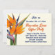 Christmas office party invitation with a Hawaiian luau theme. Big, orange bird-of-paradise flowers decorate horizontal invites with dark blue and orange text templates over ecru colour. Revers is solid orange. Choose a paper upgrade, or opt for the download version to share digitally.