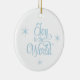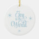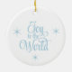 This ceramic ornament is shown in blue and white with a stars Joy to the World print.