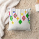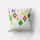 This throw pillow has a collection of ornaments hanging down made of diamond shapes, circles, and stars.