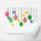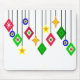 This mouse pad has a collection of ornaments hanging down made of diamond shapes, circles, and stars.