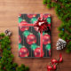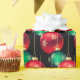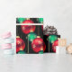 Red and green Christmas ornaments with gold string and snowflakes on black background.