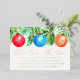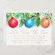 Invite guests to help decorate your Christmas tree with our beautiful Christmas Ornaments tree trimming party invites. The tree trimming party invitations feature painted watercolor Christmas ornaments in red, blue & orange hanging from green pine boughs. The words "Let's Trim The Tree" are displayed in a gold foil script with your party details featured below. The back features a simple green and white trellis pattern.