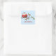 Adorable illustration of a cartoon brown owl wearing a red polka dot scarf, perched on a tree branch on a blue snowy background. Perfect as gift tag labels, envelope seals, etc