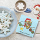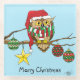 A cute brown owl with a Santa hat on is sitting on a tree branch in the winter. Christmas ornaments hang on the tree birch the owl is on.