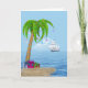 Holiday palm tree with gifts, ornaments, and boat on ocean water.