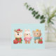 Postcard with a cute illustration featuring a bunny, a bear and a deer all dressed in festive gear. Adorable and whimsical.