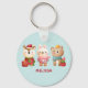 A key chain with a cute illustration featuring a bunny, a bear and a deer all dressed in festive gear. Adorable and whimsical.