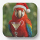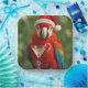 A colorful parrot wearing a red Santa hat holds a martini glass with candy canes against a lush green background, enhancing the festive feel