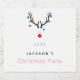A funny, cute modern minimalist image of a reindeer head with a red nose. With Christmas ornaments, baubles hanging from the antlers. No background colour, Colours: white, red, grey, blue, green. Red text: Christmas Party. Personalise and add your family name and year, text in blue green and black.