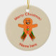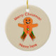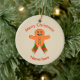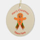 This ornament features a cute cartoon of a colourful gingerbread man. he has red and green buttons, a big smile on his face and red and green tassels around his legs ready for a Christmas party.