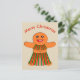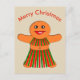 This postcard features a cute cartoon of a colourful gingerbread woman. She has black eyes with white pupils and pretty black eyelashes and a big smile on her face. She also has red and green tassels on her skirt and top ready for a Christmas party.