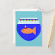 This postcard features a fun orange Christmas goldfish wearing a festive santa hat. The goldfish is swimming in the blue water of its goldfish bowl. The fish has decorated the top of the bowl with red and green bunting flags that spell out the message "Merry Fishmas". This fun seasonal fish is ready for a big Christmas party.