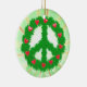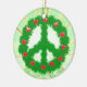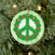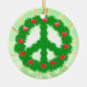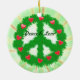 Ornament with my design of a Christmas wreath in the shape of a peace symbol with little red heart decorations. Customisable text on the back says "Peace & Love".