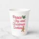 Quote: Peace Joy and Christmas Cookies. Decorated with a dove, snow crystal and a gingerbread cookie. Red text