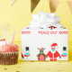 Funny Christmas and New Years holiday wrapping paper celebrating the upcoming end to a difficult 2020. A cartoon snowman and reindeer, led by a cool retro black Santa Claus, are wearing face masks standing over "Peace Out 2020" in fun red typography.