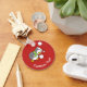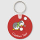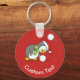 A little penguin cartoon wearing santa hat and green scarf bending to get a snow ball avoiding another one. Custom background colour. Custom text on both sides.