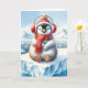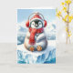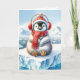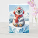 A cute watercolor penguin sitting on an iceberg wearing a red scarf, hat, and earmuffs with snowflakes.