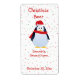 A cute label to put on your special bottles of holiday beer. It features a white background with red and green polka dots. A cartoon penguin sits in the centre wearing a red winter scarf and a santa hat. Your customisable beer information is in matching red and green.