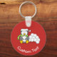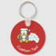 A little penguin cartoon with santa hat and green scarf sitting and holding a snowball. Custom background colour. Custom text on both sides.