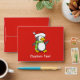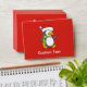 A little penguin cartoon with santa hat and green scarf walking on snow.