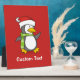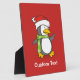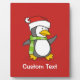 A little penguin cartoon with santa hat and green scarf walking on snow.
