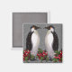 My oil pastel illustration of two penguins, face to face, with snowflakes falling all around them. Christmas holly with red berries lies at their feet.