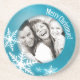 Personalised Christmas photo coaster with white Holiday snowflakes on festive blue round photo frame and Merry Christmas greeting. Add your photo to create a great personalised Christmas present or keepsake for family and friends!