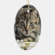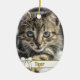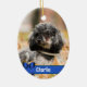 Ornament with pet photos on both sides. Little bows next to names on both sides of oval shaped ornaments. Add vertical (portrait) orientated pictures of animals, kids or anyone you choose. The ribbon and bow design on the front are white with gold, and the name is gold colour. On the back, the bow and ribbon design is dark blue with white text for the name.